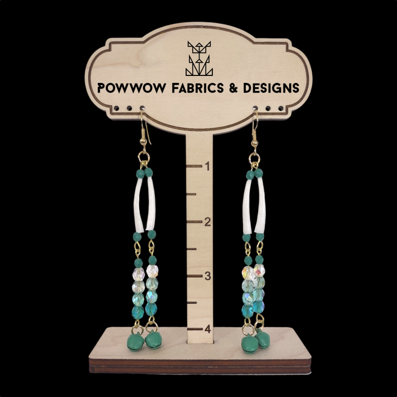 | Description | One tier single dentalia with 4 Preciosa 6mm glass fire polished AB finish beads with teal bells |